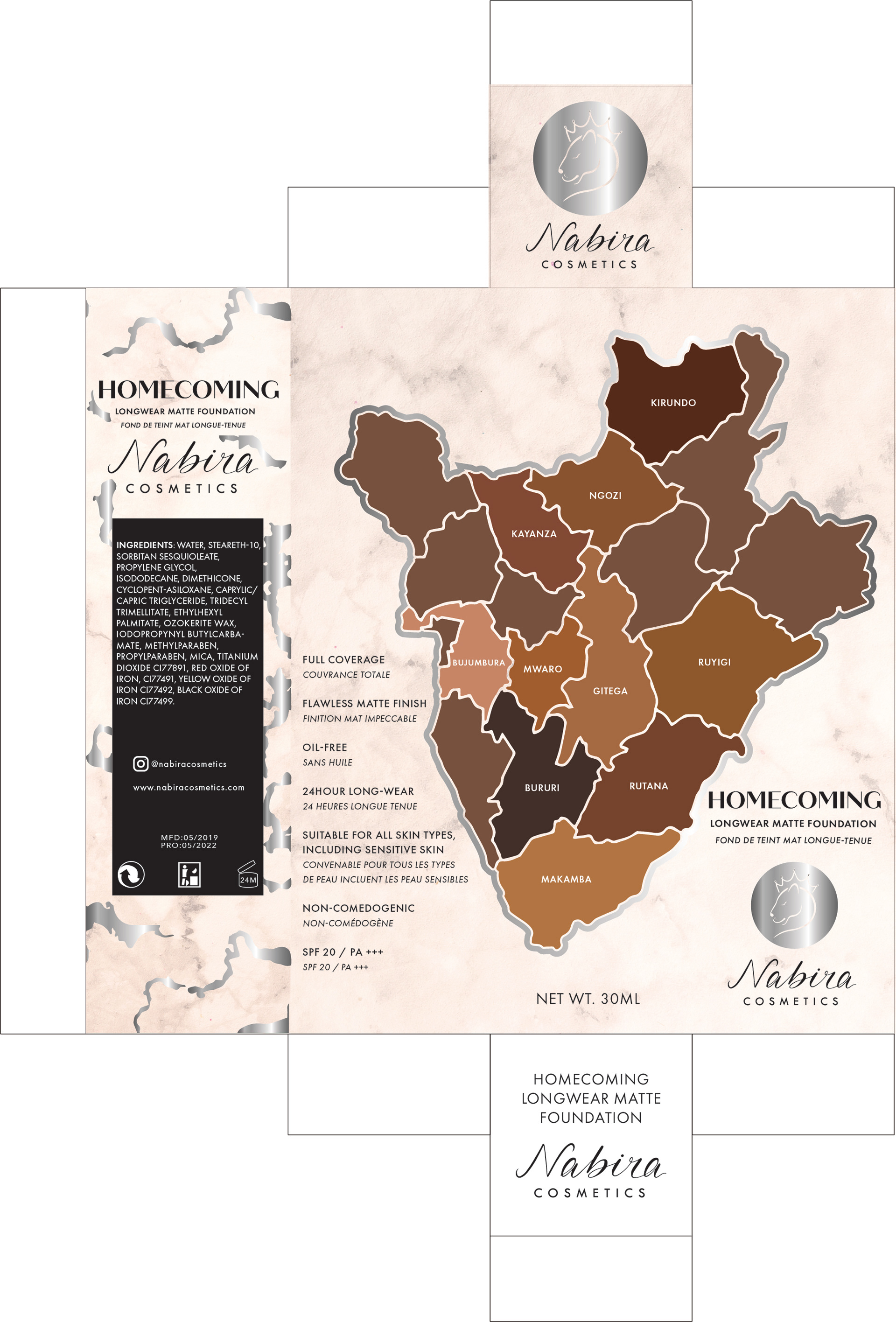 Custom packaging and logos designed for Burundi/London based beauty brand Nabira Cosmetics